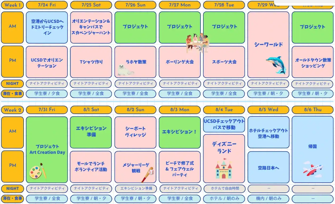 | アクティビティ | Tシャツメイキング、学内インタビュー(UCSDの学生にインタビューする)、ボランティア体験(ビーチのごみ拾いなど)、アメリカ大学進学セミナー、ナイトアクティビティ(映画、ミサンガ作り、バスケ等) |